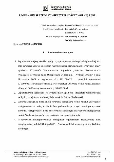 Syndyka masy upadłości sprzeda wierzytelności względem Jarosława Wernerowicza wynikającej z wyroku Sądu Okręgowego w ...